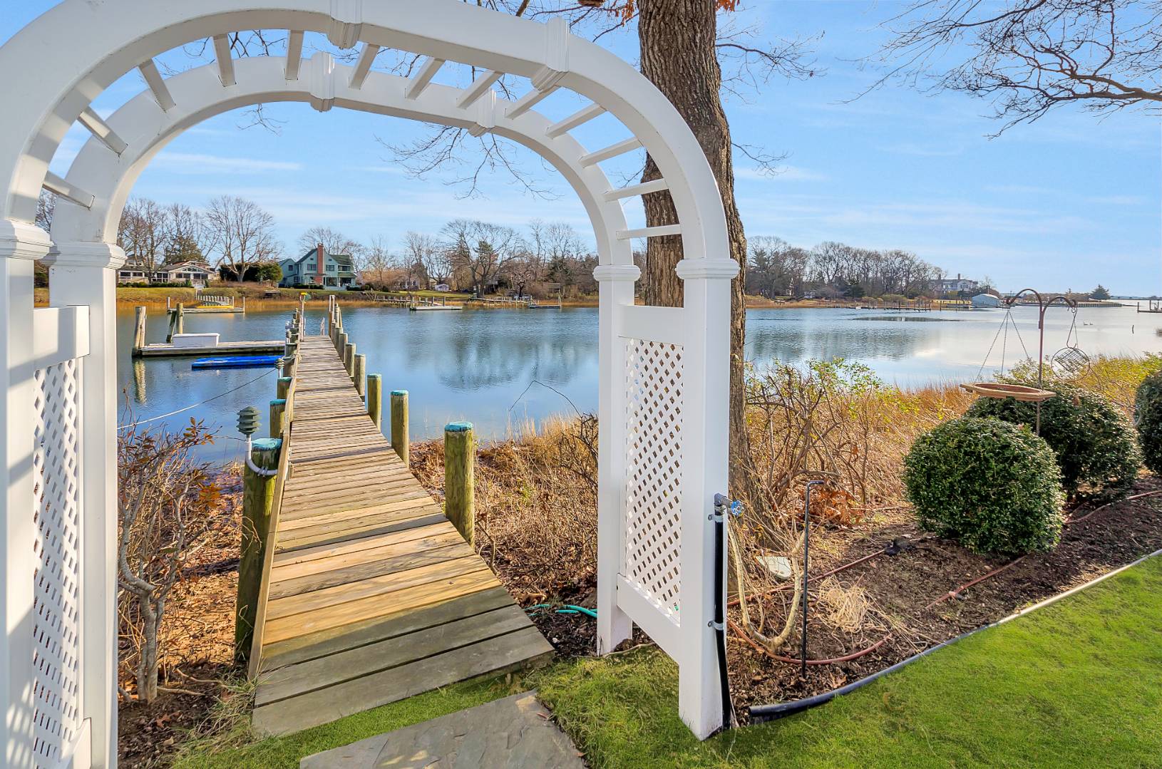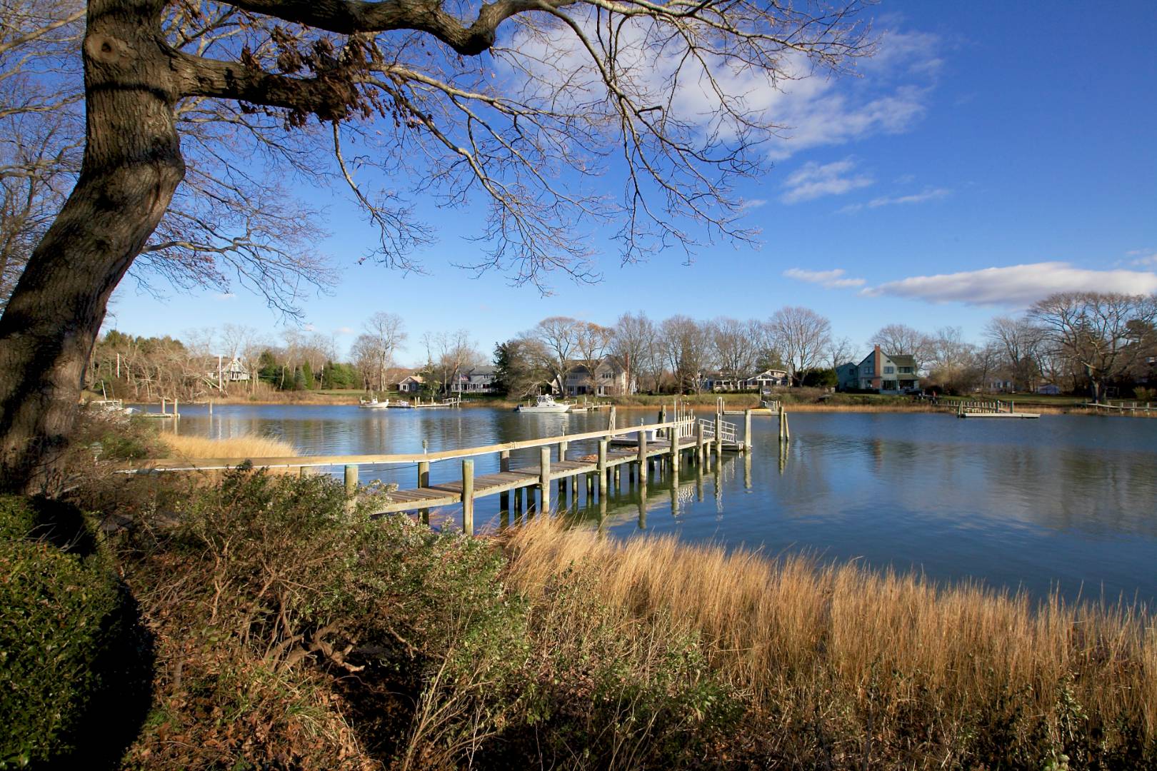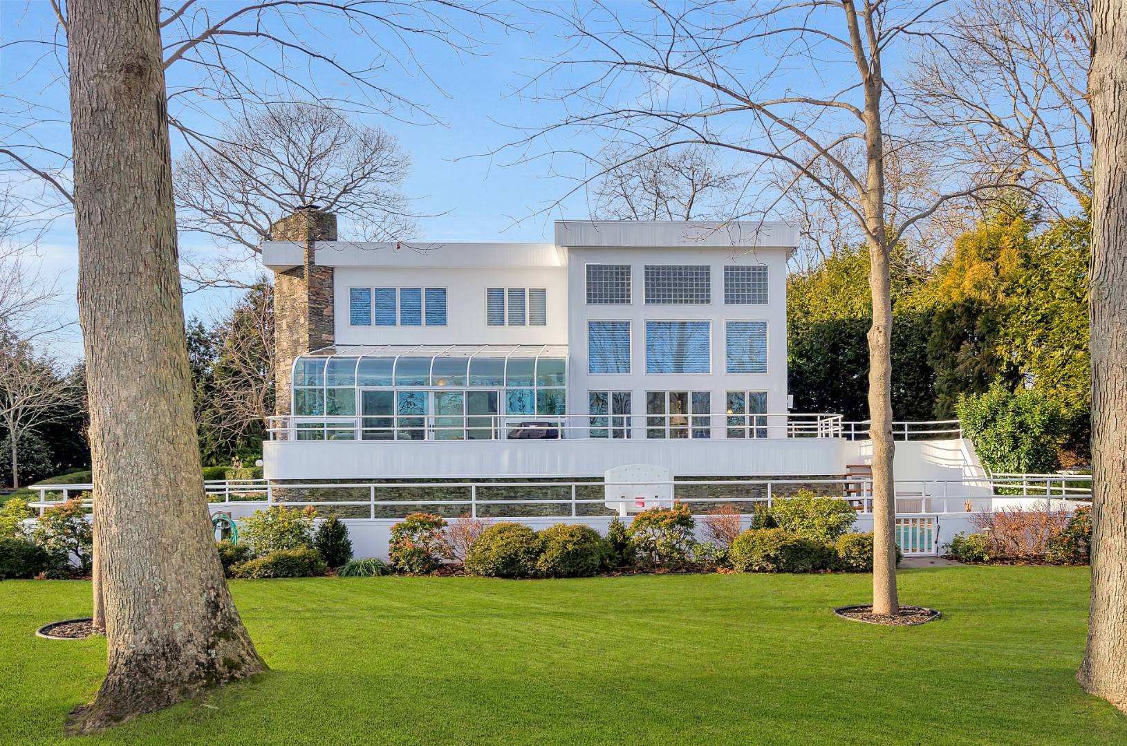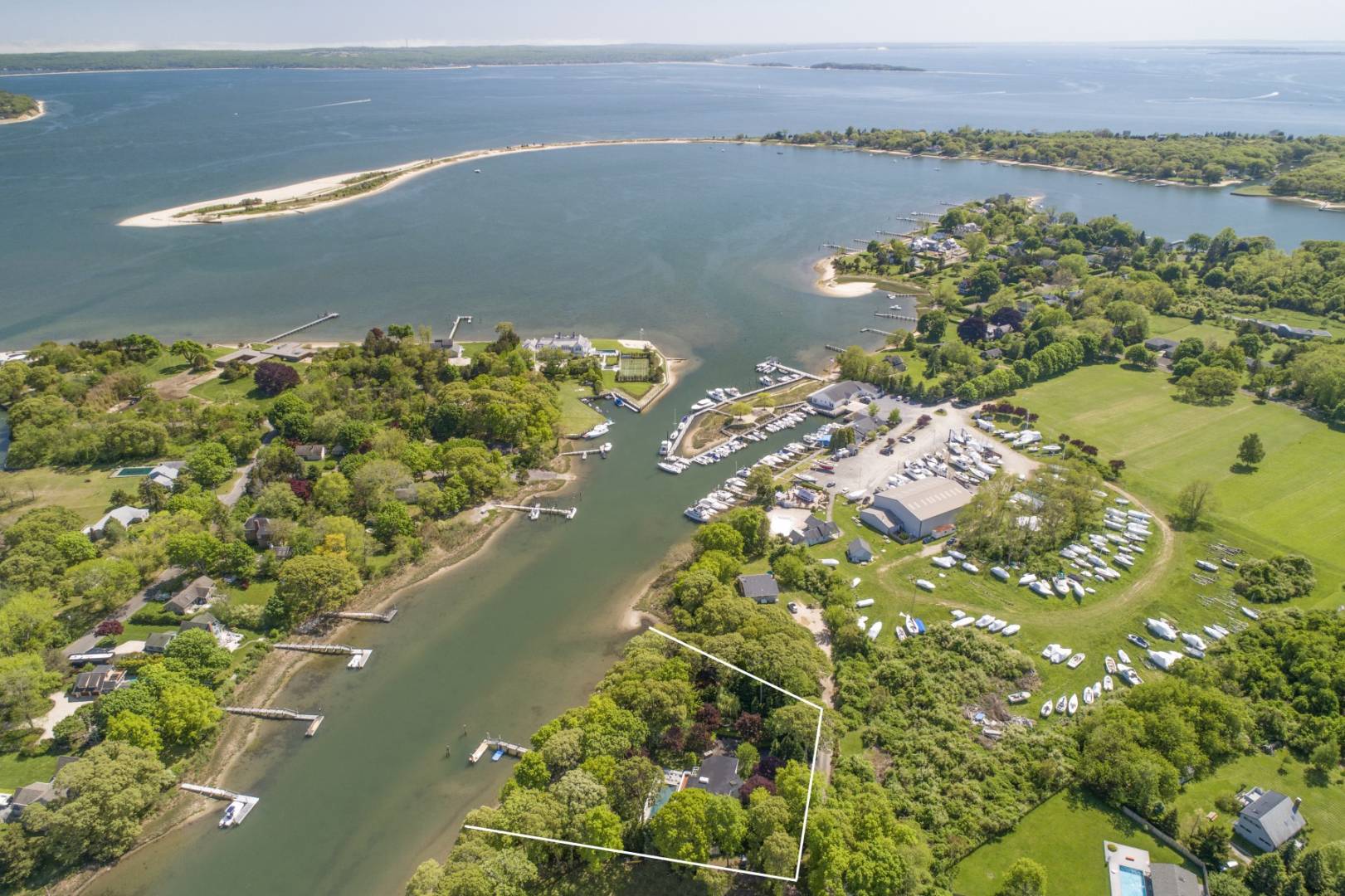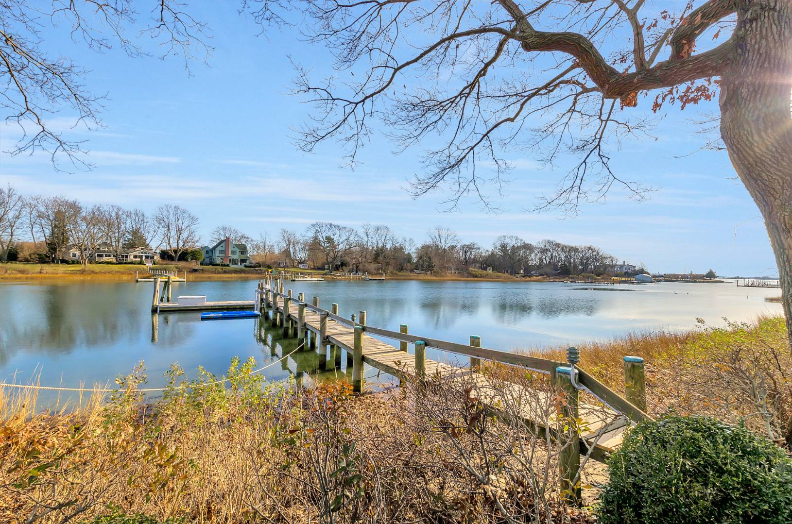 MENANTIC: Waterfront contemporary with deep water dock. Master ensuite with steam shower and Jacuzzi tub and fireplace, plus 3 additional guest bedrooms and 2.5 baths. Vaulted living room with stone wood burning fireplace and waterside views. Chef's kitchen, waterside deck and heated saline gunite pool. Light-filled lower level entertainment room with gas fireplace, bar, full bath and walk out. The property has mature specimen trees and is landscaped for privacy. Close to beaches and shops. Only minutes by motor yacht to Sag Harbor and East Hampton. Co-Exclusive: $2,495,000.